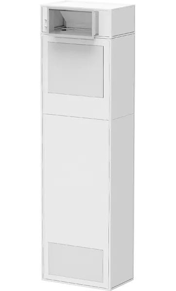 Колонна рециркуляции поставляется под заказ к ламинарному потолку. Позволяет уменьшить забор приточного воздуха с улицы за счет забора части воздуха из обслуживаемого помещения. Это позволяет снижать нагрузку и энергозатраты системы вентиляции на нагрев и охлаждение приточного воздуха.