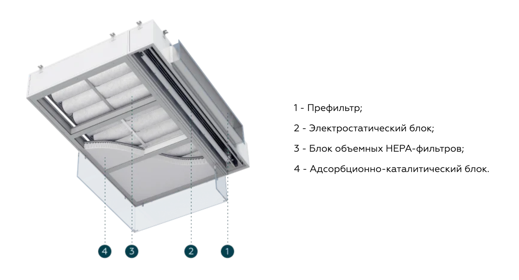 Одновременно отфильтровывает частицы, инактивирует (уничтожает) все типы микроорганизмов с эффективностью не менее 99%, очищает воздух от запахов и вредных газов. Класс фильтрации HEPA H14 соответствует требованиям к фильтрации воздуха в чистых зонах класса ИСО 5.
