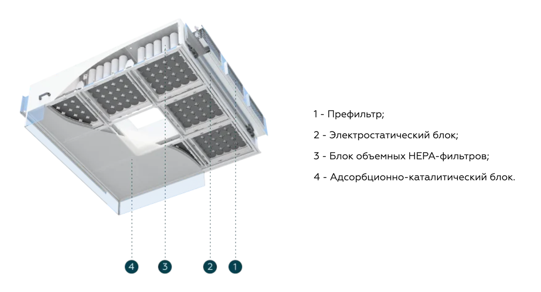 Одновременно отфильтровывает частицы, инактивирует (уничтожает) все типы микроорганизмов с эффективностью не менее 99%, очищает воздух от запахов и вредных газов.